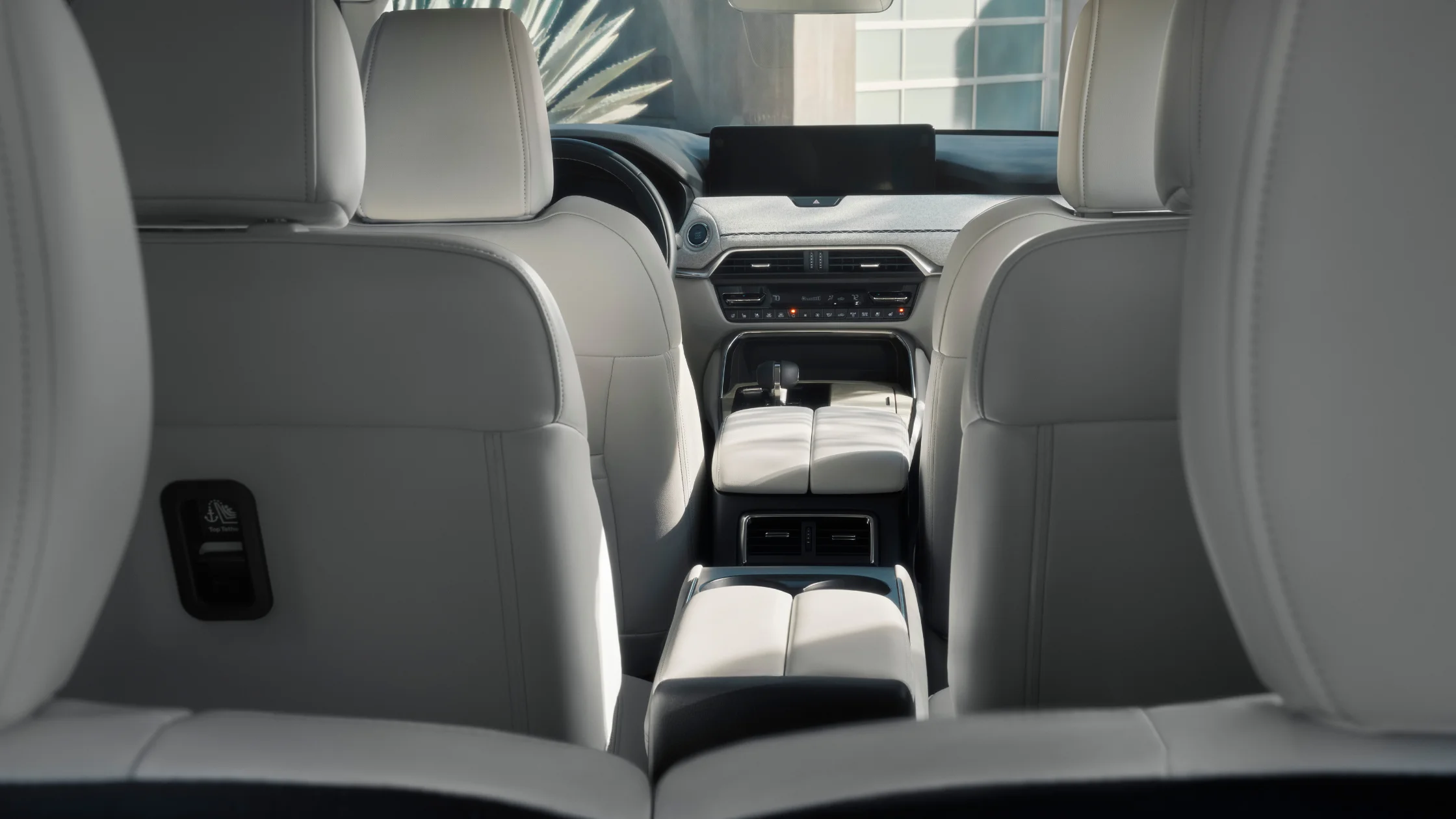 Inside, the 2025 Mazda CX-90 provides multiple seating layouts with a focus on versatility. Configurations include 6-, 7-, or 8-passenger capacities, depending on the use of second-row bench seats or captain's chairs. Headroom in the front row measures up to 41.7 inches in some trims, with 39.4 inches in the second row and 30.4 inches in the third row with certain configurations. Legroom provides 39.7 inches in the first row, 39.3 inches in the second, and up to 36.9 inches in the third. Shoulder room measures 59.2 inches in the front, 58.1 inches in the second row, and 53.3 inches in the third. Cargo space is measured at 14.9 cubic feet behind the third row in 8-passenger models, expanding to 75.2 cubic feet with both rear rows folded.
