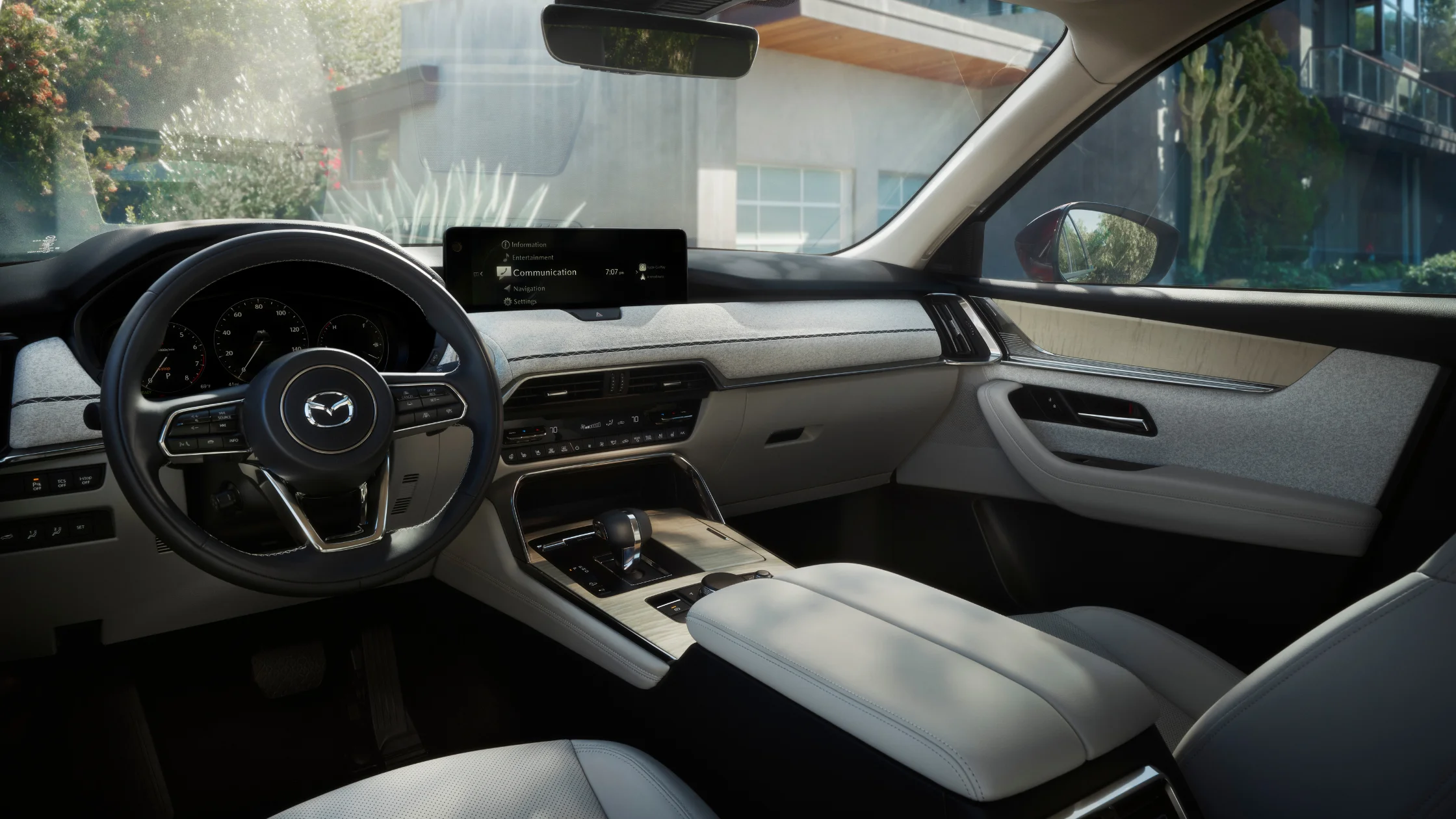 The 2025 Mazda CX-90 integrates advanced displays and infotainment controls. Base trims include a 7-inch TFT LCD meter display, while upper trims provide a fully digital 12.3-inch cluster. A 12.3-inch full-color center display is standard in most configurations, controlled through the Mazda Multi-Function Commander Control system. Select trims also include an Active Driving Display head-up display with a wide 10x3-inch view.