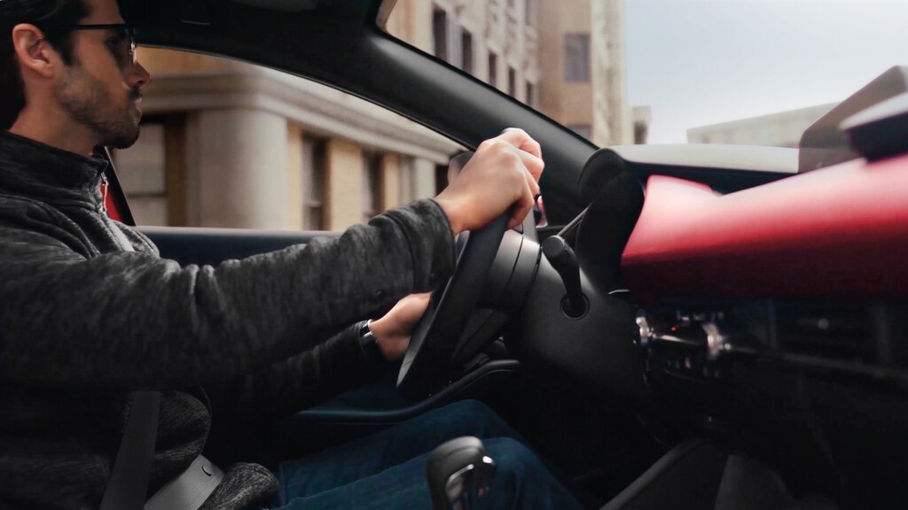 The steering wheel is tilt and telescopic adjustable, with integrated audio, cruise, and phone controls. A heated steering wheel is included on higher trims. The cabin features bright-finish interior accents, LED map and cargo lights, and a frameless auto-dimming rearview mirror with HomeLink® on the Turbo Premium Plus. Sound insulation throughout the cabin minimizes vibration and enhances overall acoustic balance, complementing the Mazda Harmonic Acoustics system.