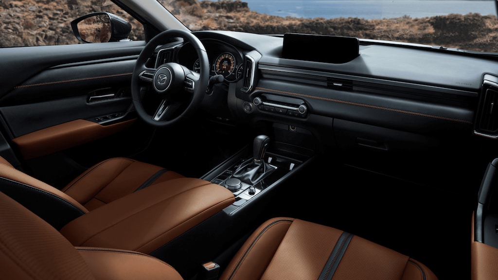 Technology features include a 10.25-inch full-color center display compatible with wireless Apple CarPlay® and Android Auto™. A seven-inch TFT LCD meter display is standard across the range. Higher trims include an Active Driving Display projected onto the windshield that integrates traffic sign recognition. Audio configurations begin with an eight-speaker system. Premium versions include a Bose twelve-speaker setup with Centerpoint® and AudioPilot®. Connectivity features include Alexa Built-In, Bluetooth® for phone and audio, wireless phone charging, Mazda Connected Services with remote engine start, remote lock and unlock, vehicle health reporting, online updates, and in-vehicle WiFi. USB-C ports are installed in both the front and rear center console areas.