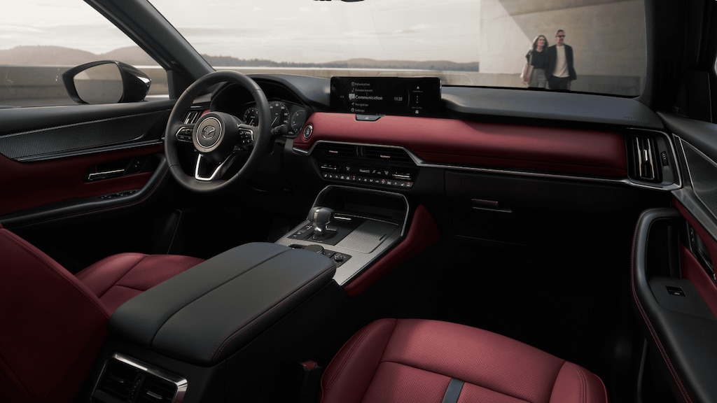 The gas-powered configurations use the e SKYACTIV G 3.3-liter inline six turbocharged engine paired with the SKYACTIV Drive eight-speed automatic transmission with manual shift mode. Standard PT versions produce 280 horsepower at 5000 rpm and 332 pound-feet of torque at 2000 rpm with regular fuel recommended. High PT versions increase output to 340 horsepower at 5000 rpm and 369 pound-feet of torque at 2000 rpm with premium fuel recommended. All gas models incorporate the M Hybrid Boost 48-volt mild hybrid system that assists during acceleration and low-speed operation to support smooth engagement and improved control.