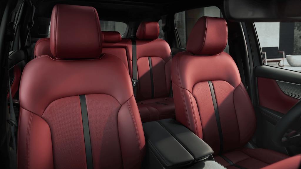 The interior layout supports a five-passenger configuration. Seating materials vary by trim and include leatherette, leather in Black or Greige, Nappa leather in Black or Red, or quilted Nappa leather in Tan on the High PT Premium Plus. Front seating uses either manual or eight-way power adjustment. Many trims include driver lumbar support and two-position memory. Ventilated front seats and heated second-row seats are available on selected trims. Tri-zone automatic climate control is standard.