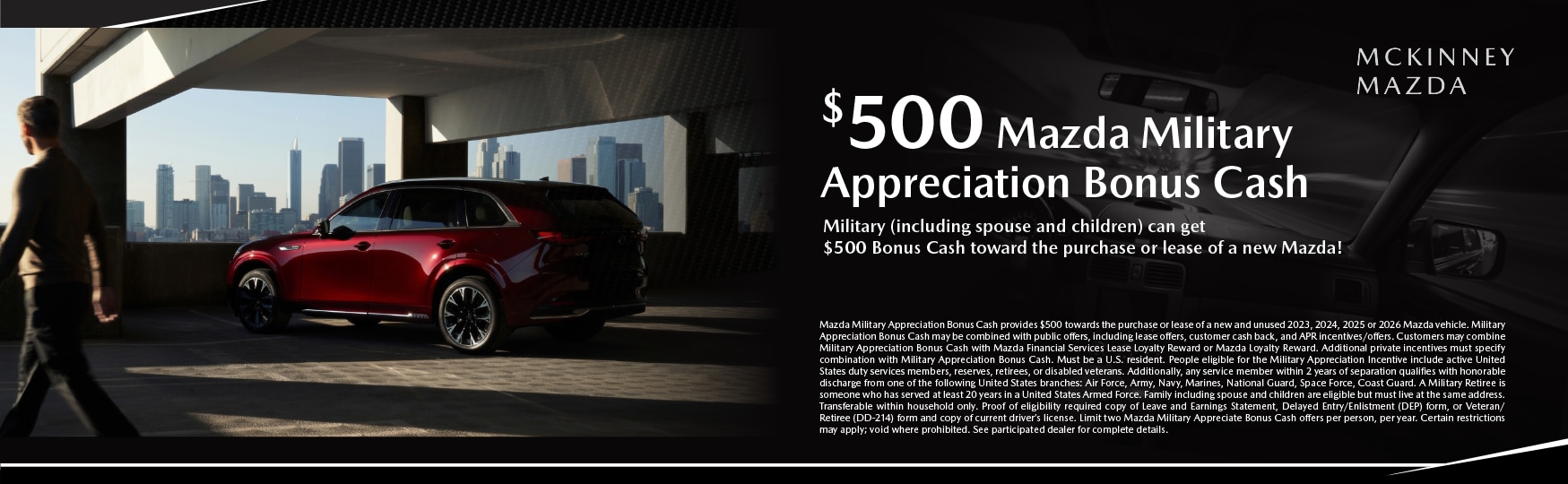 Mazda Military Appreciation Bonus Cash provides $500 towards the purchase or lease of a new and unused 2023, 2024, 2025 or 2026 Mazda vehicle. Military Appreciation Bonus Cash may be combined with public offers, including lease offers, customer cash back, and APR incentives/offers. Customers may combine Military Appreciation Bonus Cash with Mazda Financial Services Lease Loyalty Reward or Mazda Loyalty Reward. Additional private incentives must specify combination with Military Appreciation Bonus Cash. Must be a U.S. resident. People eligible for the Military Appreciation Incentive include active United States duty services members, reserves, retirees, or disabled veterans. Additionally, any service member within 2 years of separation qualifies with honorable discharge from one of the following United States branches: Air Force, Army, Navy, Marines, National Guard, Space Force, Coast Guard. A Military Retiree is someone who has served at least 20 years in a United States Armed Force. Family including spouse and children are eligible but must live at the same address. Transferable within household only. Proof of eligibility required copy of Leave and Earnings Statement, Delayed Entry/Enlistment (DEP) form, or Veteran/Retiree (DD-214) form and copy of current driver's license. Limit two Mazda Military Appreciate Bonus Cash offers per person, per year. Certain restrictions may apply; void where prohibited. See participated dealer for complete details.