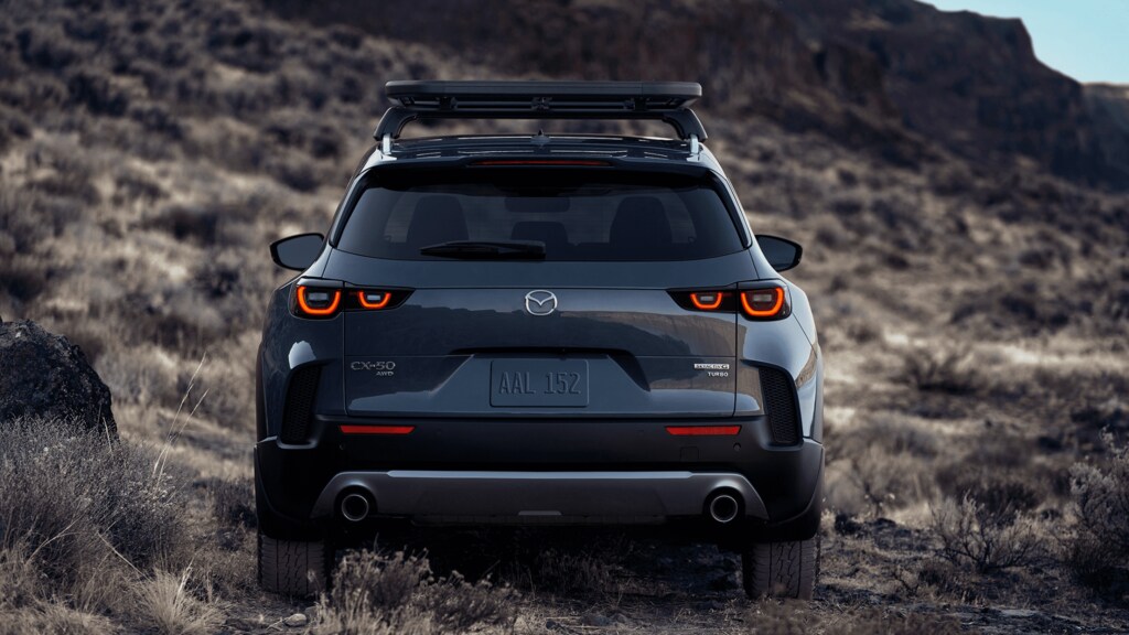 Step inside the 2024 Mazda CX-50 to find high-quality materials, including available Terracotta leather trim and durable yet stylish fabrics inspired by outdoor gear, which combine to create a warm and inviting atmosphere. The panoramic moonroof allows you to soak in natural light and stunning views. Outside, the reflective surfaces and bold lines of the 2024 Mazda CX-50's design capture the beauty of its surroundings, making a powerful statement wherever you go.