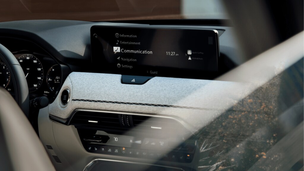 The 2024 Mazda CX-90 PHEV includes features like the available 360° View Monitor, providing an enhanced view of the vehicle's surroundings, and the Rear Seat Alert system, ensuring awareness of rear passengers. The infotainment system supports wireless Apple CarPlay®, keeping you connected on the go. The 12.3-inch center display offers clear and accessible information, enhancing the driving experience.