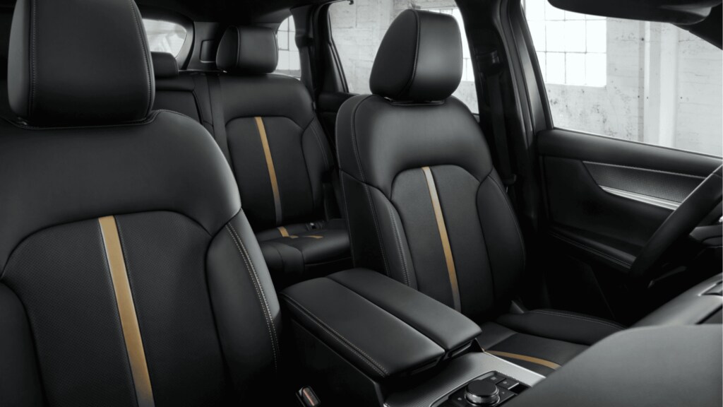 The 2025 Mazda CX-70 PHEV seats up to five passengers comfortably. The driver's seat is an 8-way power-adjustable unit with lumbar support and memory, while the front passenger seat offers 4-way power adjustment. Heated and ventilated seats are available in the Premium Plus trim. The 60/40 split fold-down second-row seats offer reclining functionality and retractable window shades. A leather-wrapped steering wheel with paddle shifters, a heated option in the Premium Plus trim, adds comfort and control. Three-zone automatic climate control with a pollen filter maintains cabin air quality. Storage options include a glove compartment, a front center console armrest with storage, and rear cargo area storage with underfloor compartments. Charging and power outlets include a 12V power outlet, a 1500W charging outlet, and a wireless phone charger.